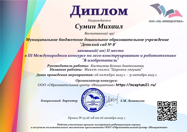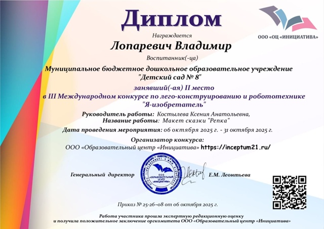 28 октября 2025г. дети кружка "Лего-центр "Техник-изобретатель" Миша С., Катя Р., Семен Ч., Вова Л.  под руководством педагога Костылевой Ксении Анатольевны приняли участие в III Международном конкурсе по лего-конструированию и робототехники "Я - изобретатель". На конкурсе жюри будет оценивать не только художественное мастерство (технику и качество исполнения работы), но и оригинальность, и творческую индивидуальность. Поздравляем ребят!|